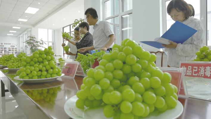 ↓农业专家评委对参赛的阳光玫瑰葡萄进行评比。