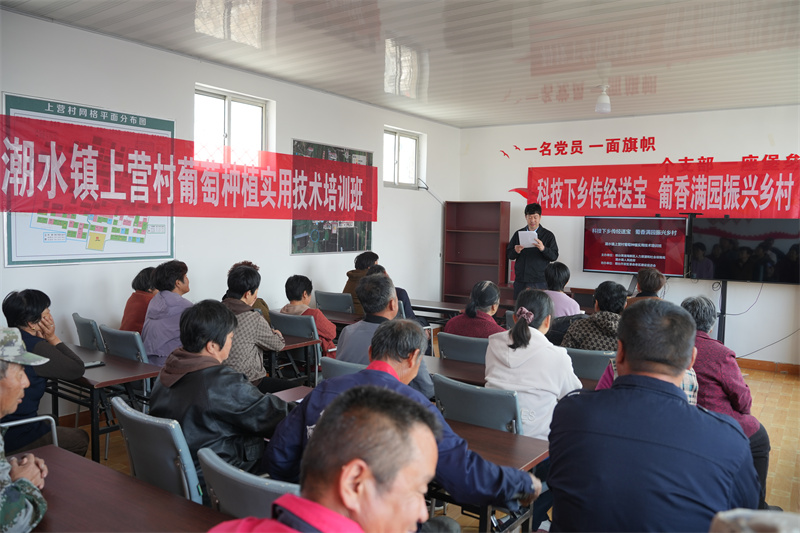2026年4月15日,烟台黄渤海新区潮水镇上营村葡萄种植实用技术培训班顺利开班。本次培训由黄渤海新区人力资源和社会保障局、潮水镇人民政府主办,烟台经济技术开发区革命老区建设促进会协办。烟台经济技术开发区革命老区建设促进会办公室主任于国光、潮水镇上营村第一书记刘军、上营村党支部书记孙明出席开班仪式。本次培训班特别邀请烟台农科院唐美玲、山东农业大学杜远鹏两位葡萄种植领域权威专家授课,上营村及周边村落约30名玫瑰香葡萄种植农户参与本次培训。
