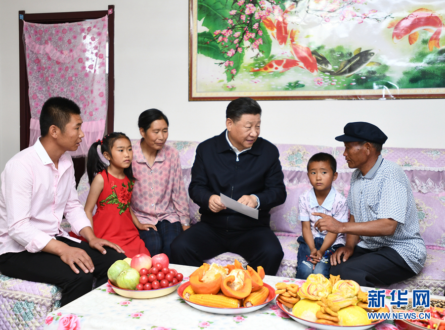 8月19日至22日,中共中央总书记、国家主席、中央军委主席习近平在甘肃考察。这是21日上午,习近平在武威市古浪县黄花滩生态移民区富民新村村民李应川家,同李应川一家拉家常。 新华社记者 谢环驰 摄