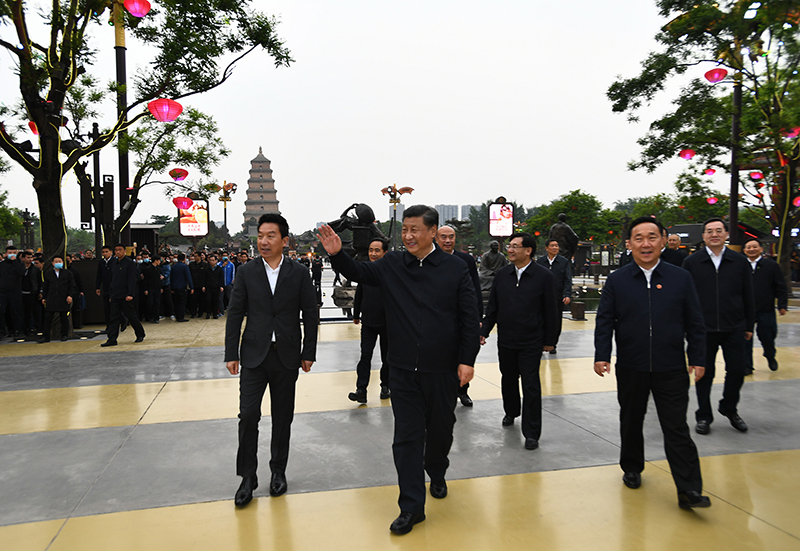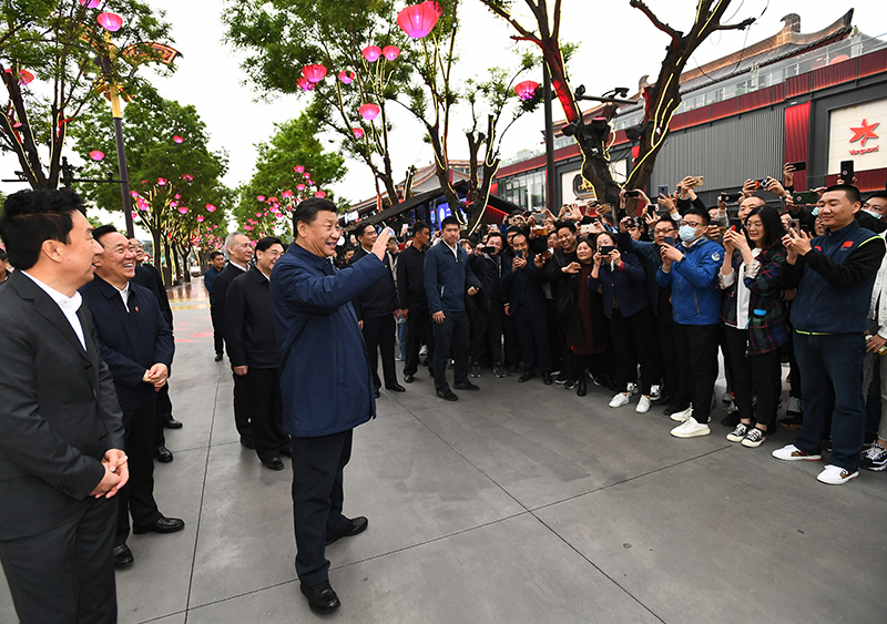 4月20日至23日,中共中央总书记、国家主席、中央军委主席习近平在陕西考察。这是4月22日,习近平在西安大唐不夜城步行街考察时,向游客挥手致意。新华社记者 谢环驰 摄