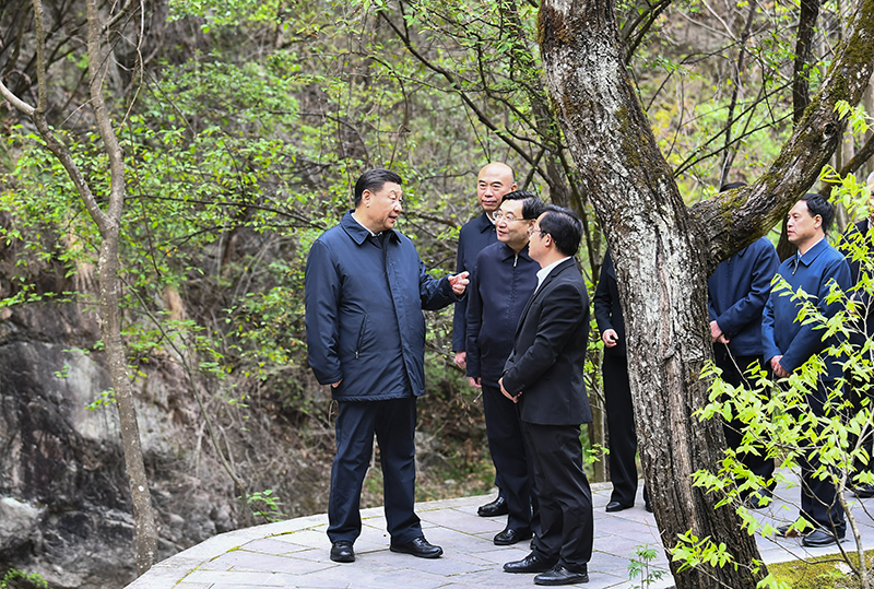 4月20日至23日,中共中央总书记、国家主席、中央军委主席习近平在陕西考察。这是4月20日,习近平在位于秦岭山脉东段的牛背梁国家级自然保护区羚牛谷,了解秦岭生态环境保护情况。新华社记者 谢环驰 摄